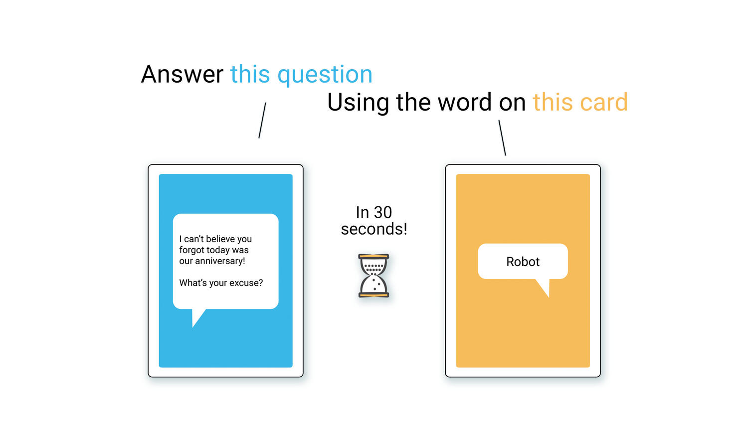With your orange card, you have 30 seconds to answer. The word may have nothing to do with the question, so be creative! Make up any absurd scenario - even if it makes no sense.