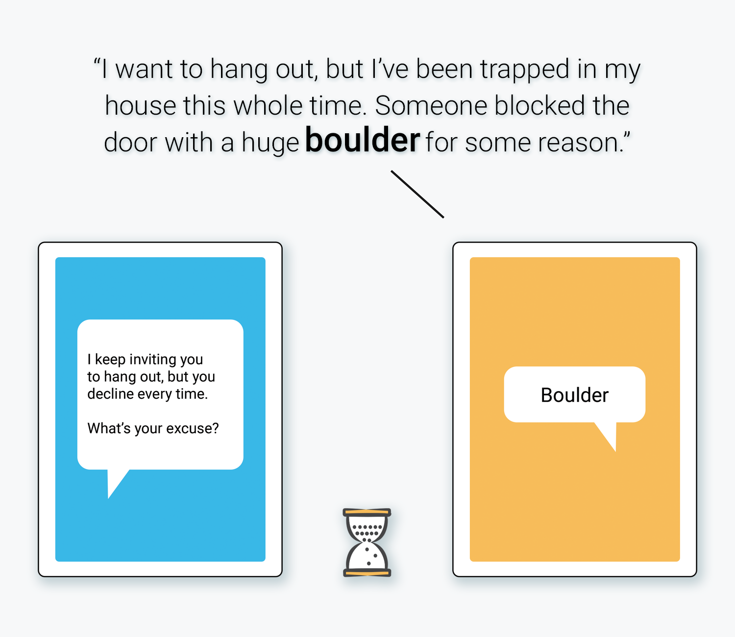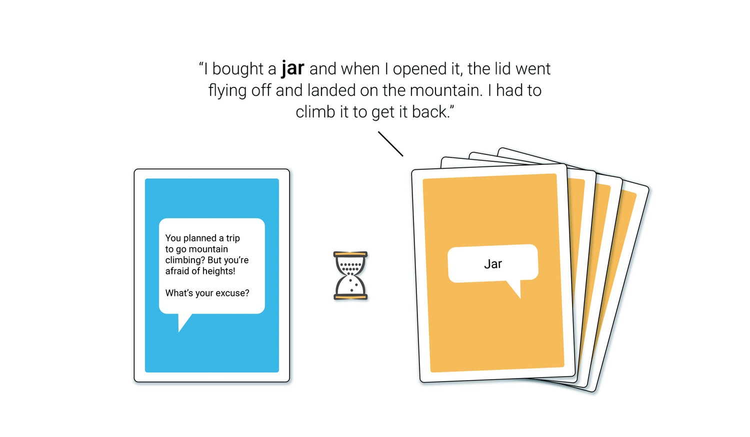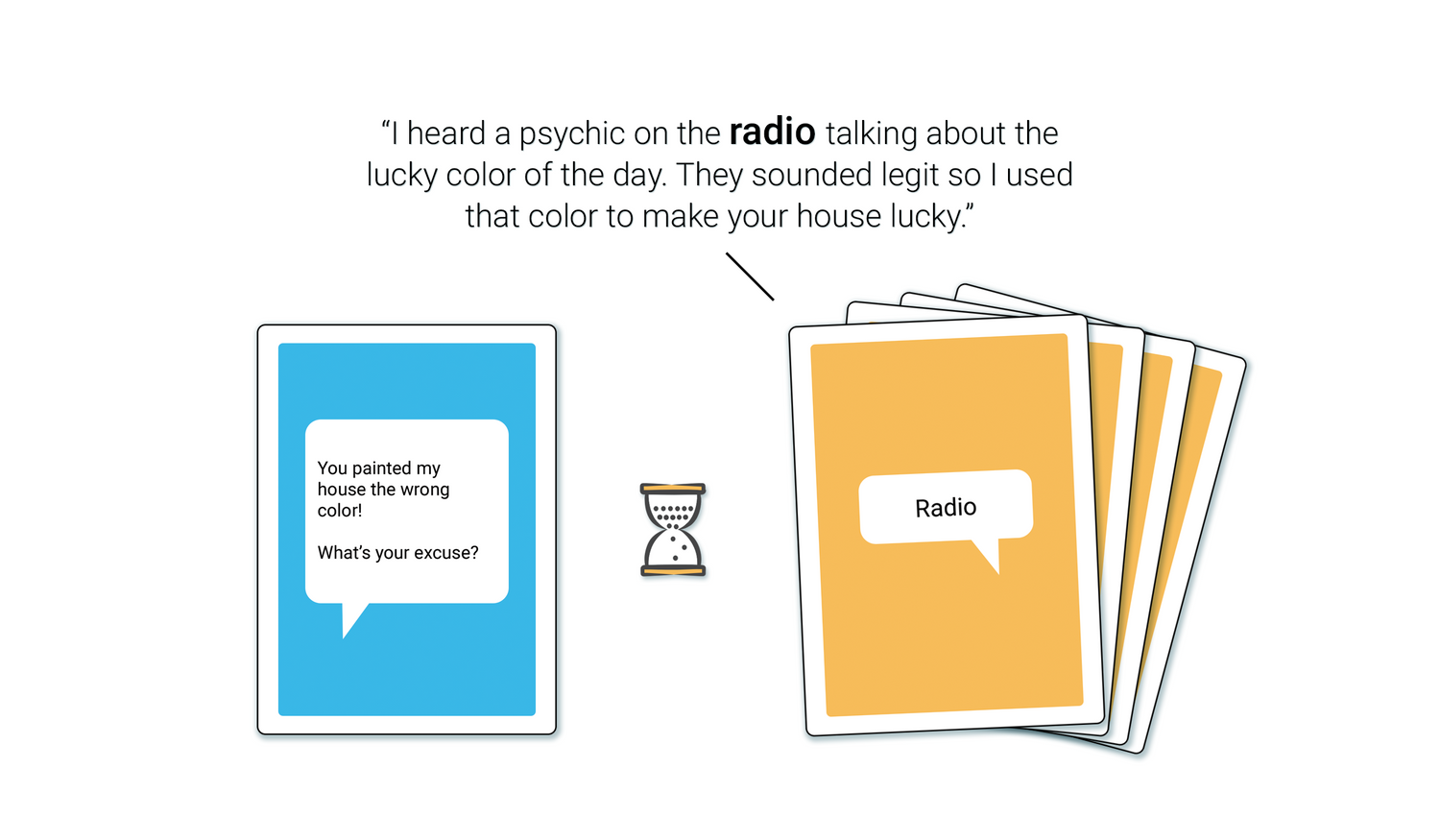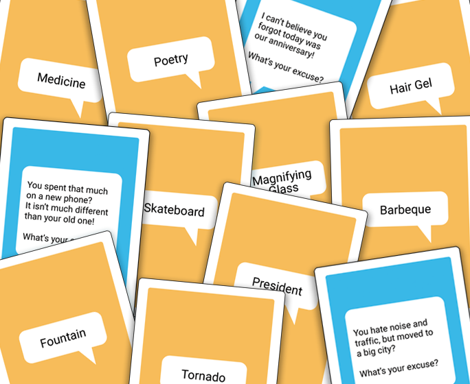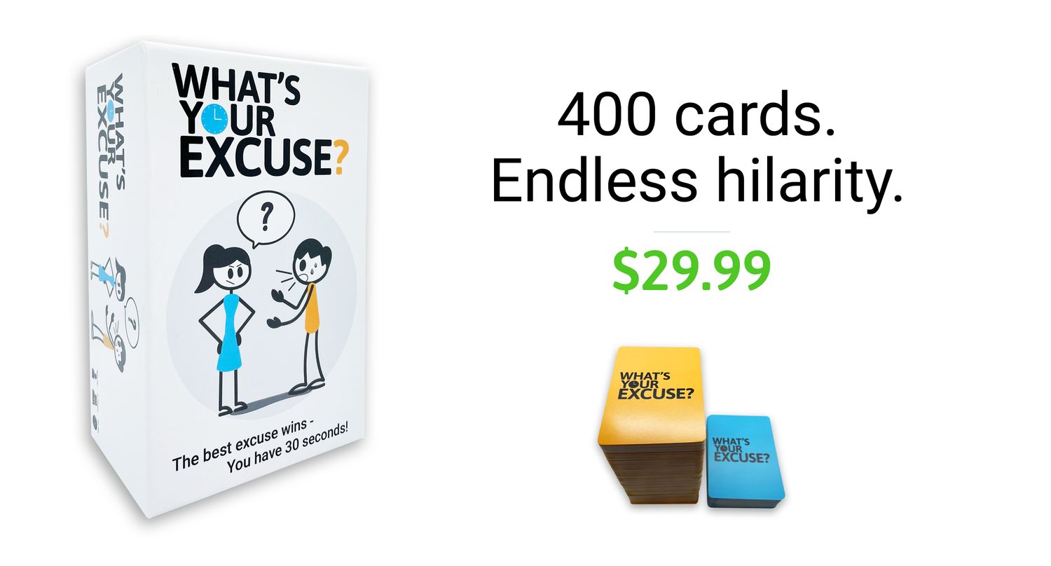 Come up with the best excuse among the other players. At the end of each round, a rotating judge chooses their favorite answer.